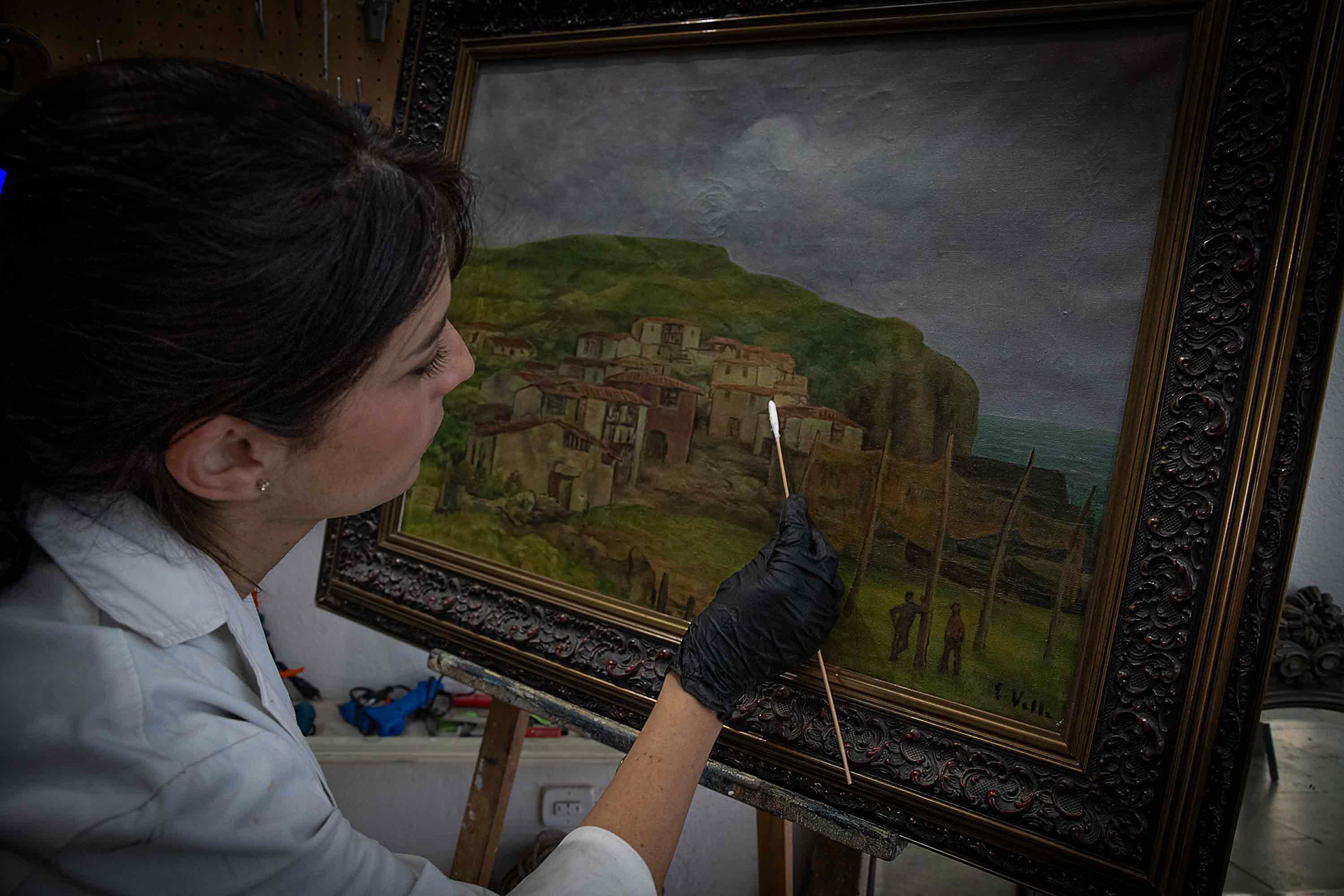 Su técnica es casi alquímica: observa la obra bajo luz ultravioleta hasta descubrir los secretos bajo las capas de barniz oxidado. Después prepara la mezcla justa de disolventes que permite limpiar sin borrar, sanar sin herir.