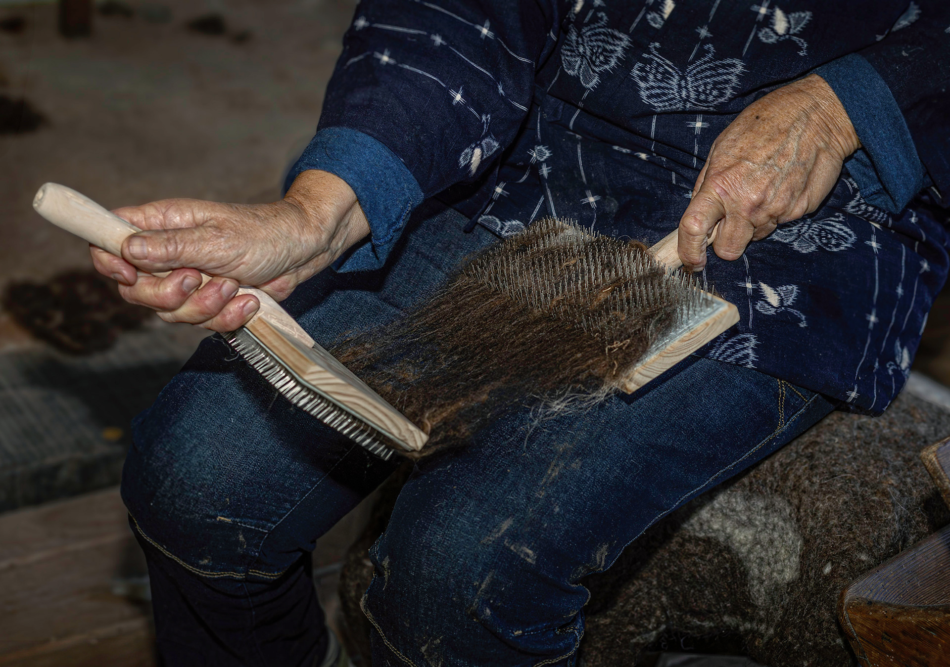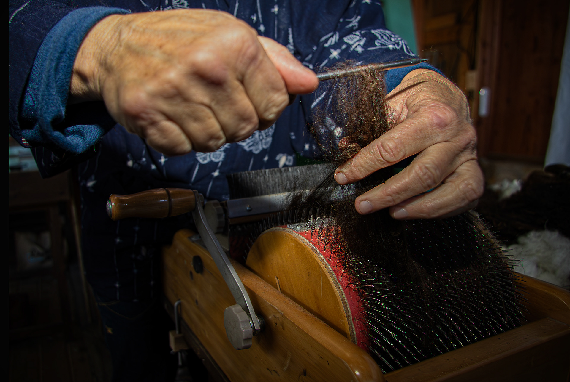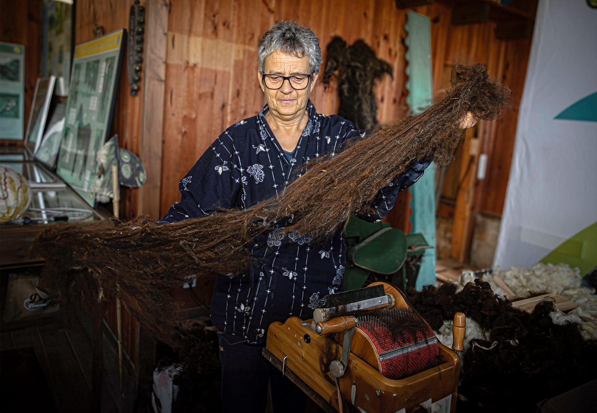 Con su propio rebaño de corderos xaldos, Danielle guía a quienes desean aprender el proceso completo: desde el escogido inicial de la lana, lavado con agua de lluvia, secado y posterior tratamiento como el paso por el “lobo” para escarmenar (soltar) la lana, hasta la cardadura de tambor o manual, con los cardadores de mano.